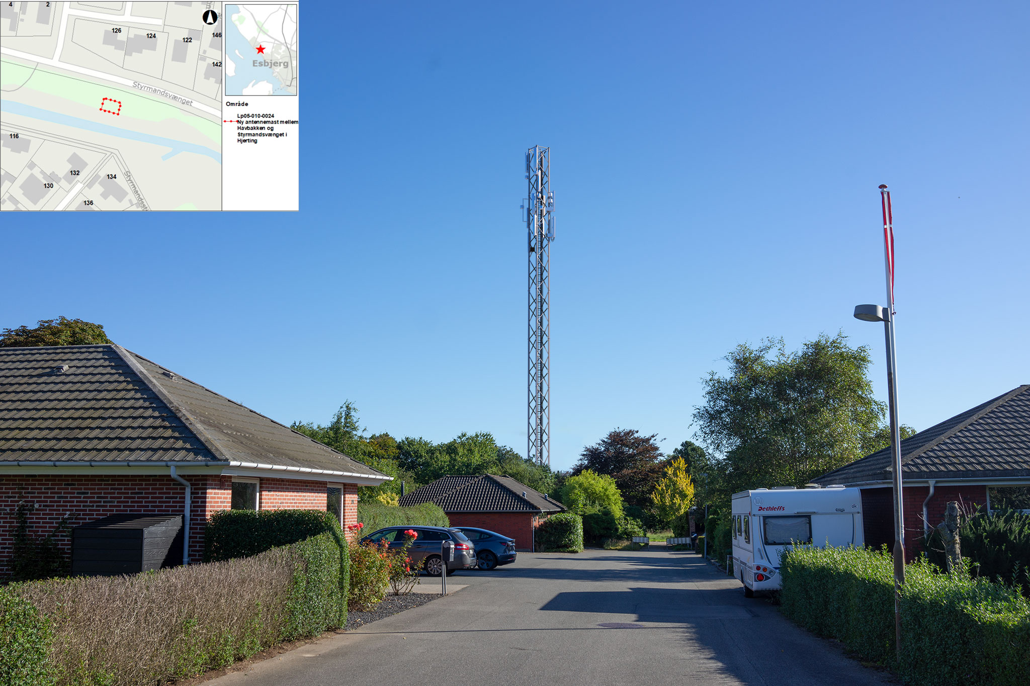 Masten vil kræve fældning af store træer placeret midt den grønne naturskønne kile for ikke kun at gøre plads til gittermasten, men også plads til den fundament og 12 meter brede gitterhegn, der skal omringe masten. Masten og gitterhegnet vil ikke blot vil stå I stærk kontrast og ødelægge området med hygge og herligheden. Den vil også stå placeret meget tæt på Havbakkens og Styrmandsvængets huse. En gittermast som vil række voldsomt op I himlen, der vil kunne ses fra de fleste huse I det omkringliggende område. Masten vil formentlig have en negativ effekt på salgsværdien på boligerne omkring. Obs. billedet er en vejlende visualisering af hvordan gittermasten på 48 meter kommer til at stå, skulle Esbjerg Plan og byudviklingsudvalg, vælge at godkende Cellnex ansøgningen.